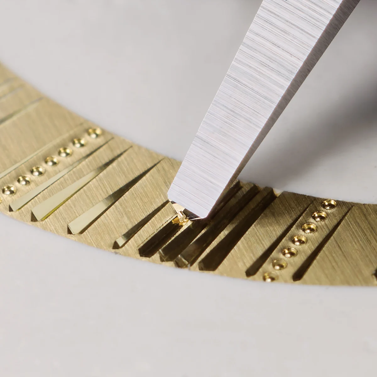 The dial of the Credor Goldfeather Tourbillon Engraved GBCF997 is a masterpiece of understated luxury and technical execution. It comprises two distinct components: a raised central section that sits atop an outer ring housing the hour markers and minute track. The dial’s surface is finished with a radiating satin texture, achieved through a meticulous grinding technique. The challenge and artistry lie in producing a seamless visual motif across the entire dial, despite its two-part construction. This requires exceptional skill to ensure the texture flows uninterrupted between the elevated and surrounding elements, creating a harmonious and unified appearance.