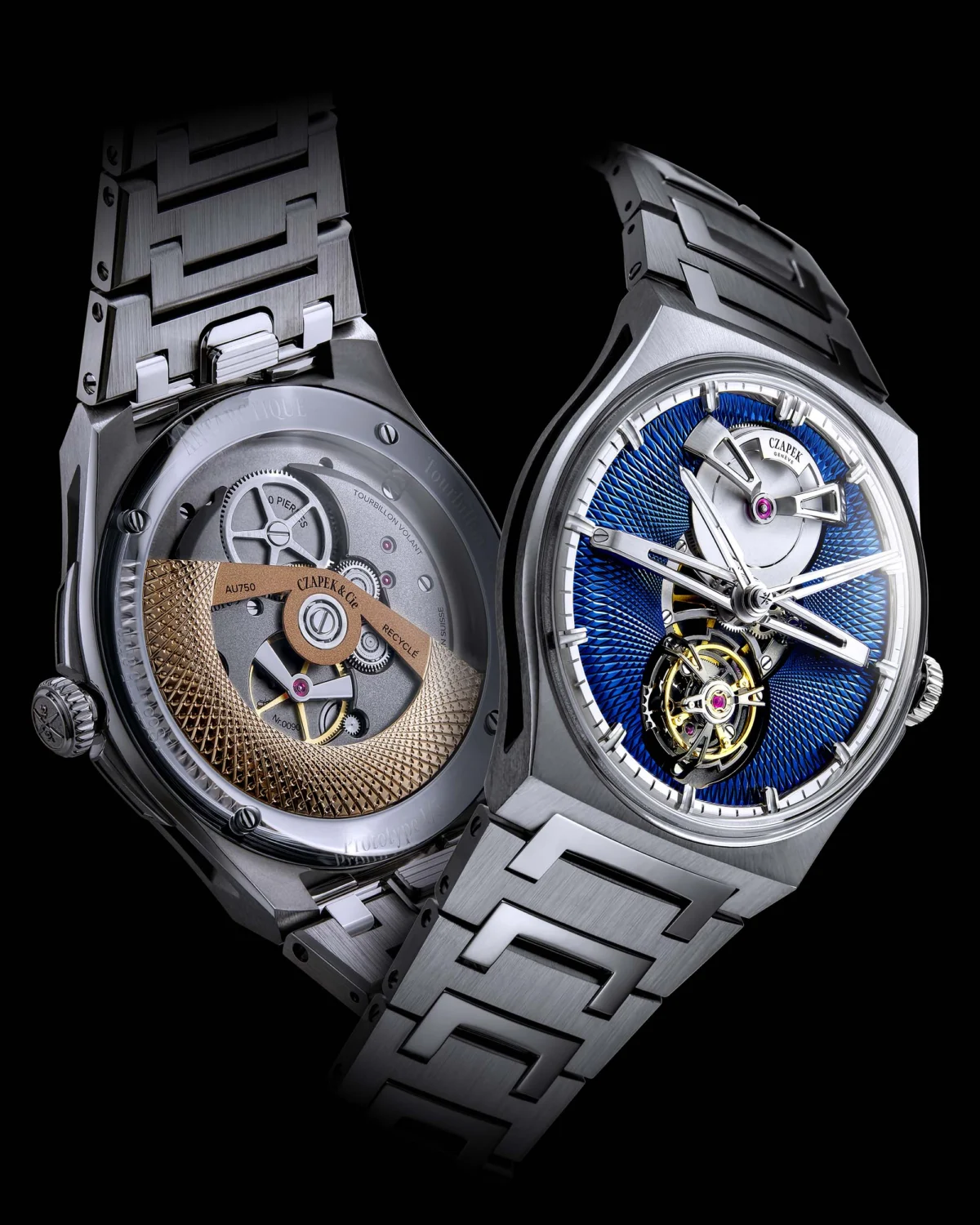 The Antarctique Tourbillon Titanium Cosmic Blue is positioned as the most aesthetically striking and technically advanced of the trio. It shares the same titanium case as the Révélation but distinguishes itself with the depth and intricate texture of its hand-guilloché dial, executed in Czapek’s signature Singularité pattern. This artisanal technique, meticulously performed by Metalem, a renowned specialist in guilloché work, adds a layer of exquisite detail and tactile richness.