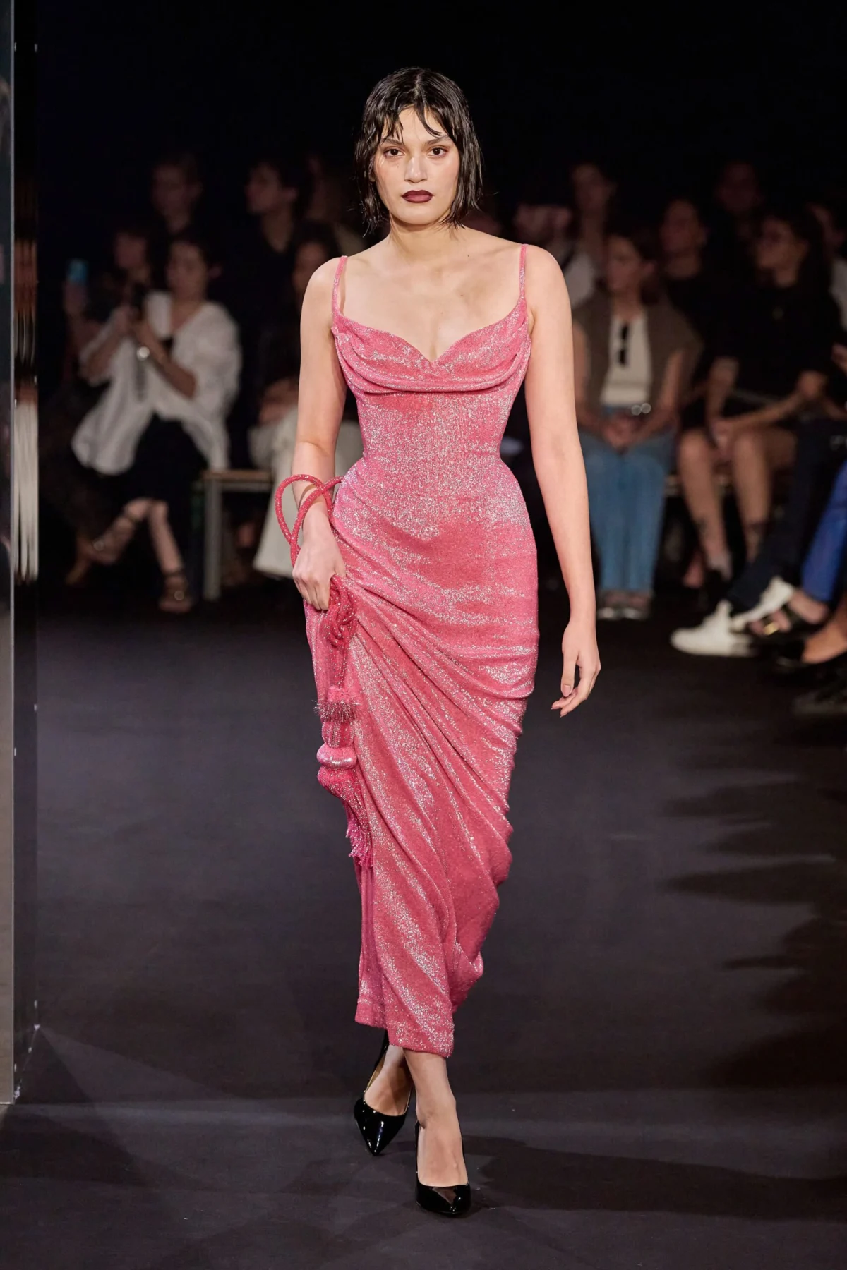 Model Anok Yai provided one of the evening’s most technically significant moments, appearing in a sculptural ensemble from Ashi Studio’s Spring 2026 Couture collection. The garment featured a green crocodile-skin texture, utilizing advanced fabric manipulation to create a liquid-like sheen. The silhouette was characterized by sharp, carved lines and a flared structure that demonstrated the house’s focus on architectural precision.