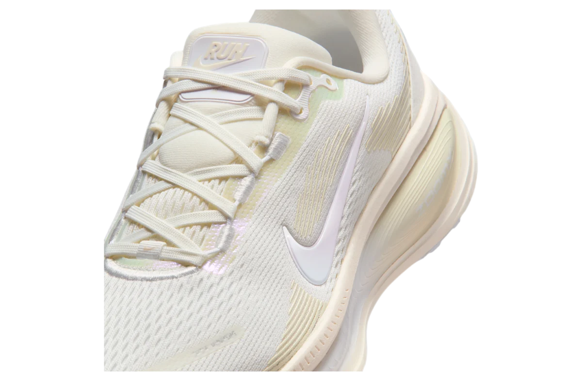 At the heart of the Nike Vomero 18 WMNS lies a meticulously engineered design focused on optimizing the running experience. The upper is constructed from a breathable mesh material, predominantly in a pristine Summit White hue. This choice of material is critical for ventilation, allowing heat and moisture to escape, thereby maintaining a comfortable internal environment for the foot, especially during prolonged periods of activity. Accentuating the Summit White base are overlays in a soft, creamy Chalk shade. These overlays not only contribute to the shoe’s sophisticated visual appeal but also serve a functional purpose, providing targeted support and structure to key areas of the foot. The integration of these two neutral tones creates a subtle yet impactful contrast, lending the shoe a modern and versatile aesthetic that can easily complement a wide range of athletic and casual attire.