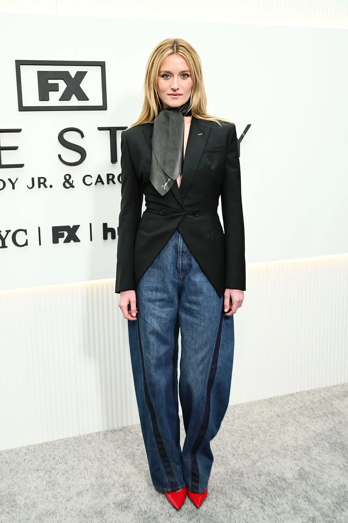 The ensemble worn by Pidgeon serves as a definitive showcase of Sarah Burton’s design vernacular at Givenchy. The center of the look was a cutaway tailored jacket, a silhouette that has become a hallmark of Burton’s career. The garment featured sharply defined shoulders and a meticulously cinched waist, echoing the rigorous tailoring of traditional Parisian couture while maintaining a modern, architectural edge. However, the styling of the jacket departed from formal tradition through its pairing with cocoon-shape denim jeans. This juxtaposition of high-fashion tailoring with casual, oversized denim reflects a broader industry trend toward "elevated casual" or "high-low" dressing, which seeks to blend luxury craftsmanship with everyday utility.